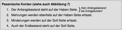 Unverändert wird auch bei passivischen Konten die linke Konto-Seite als Soll bezeichnet und die rechte Konto-Seite als Haben. Allerdings sind die Inhalte der Konten-Seiten spiegelverkehrt zu den aktivischen Konten. Das bedeutet, dass auf der Haben-Seite die Mehrungen zu finden sind und auf der Soll-Seite die Minderungen. Zu den passivischen Konten gehören alle Positionen auf der Passiva-Seite der Bilanz (sog. Passivkonten – siehe Abbildung 7 und Beispiel 26) sowie die Ertragskonten (Beispiel 27).
